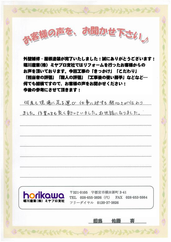 何度も現場に足を運び、仕事に対する熱心さが伝わりました。作業の方もよく動いていました。お世話になりました。