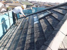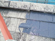 | すでに硬くなり、外れかかっていたシーリングを除去し、新たにシーリングを施工します。 | シーリングの乾きを待って、塗らない部分をカバーします。養生という手法です。 | 養生の前に、屋根の施工に入りました。プライマーを浸透させるように塗布していきます。吸い込みが激しかったので、2回塗布しました。 |